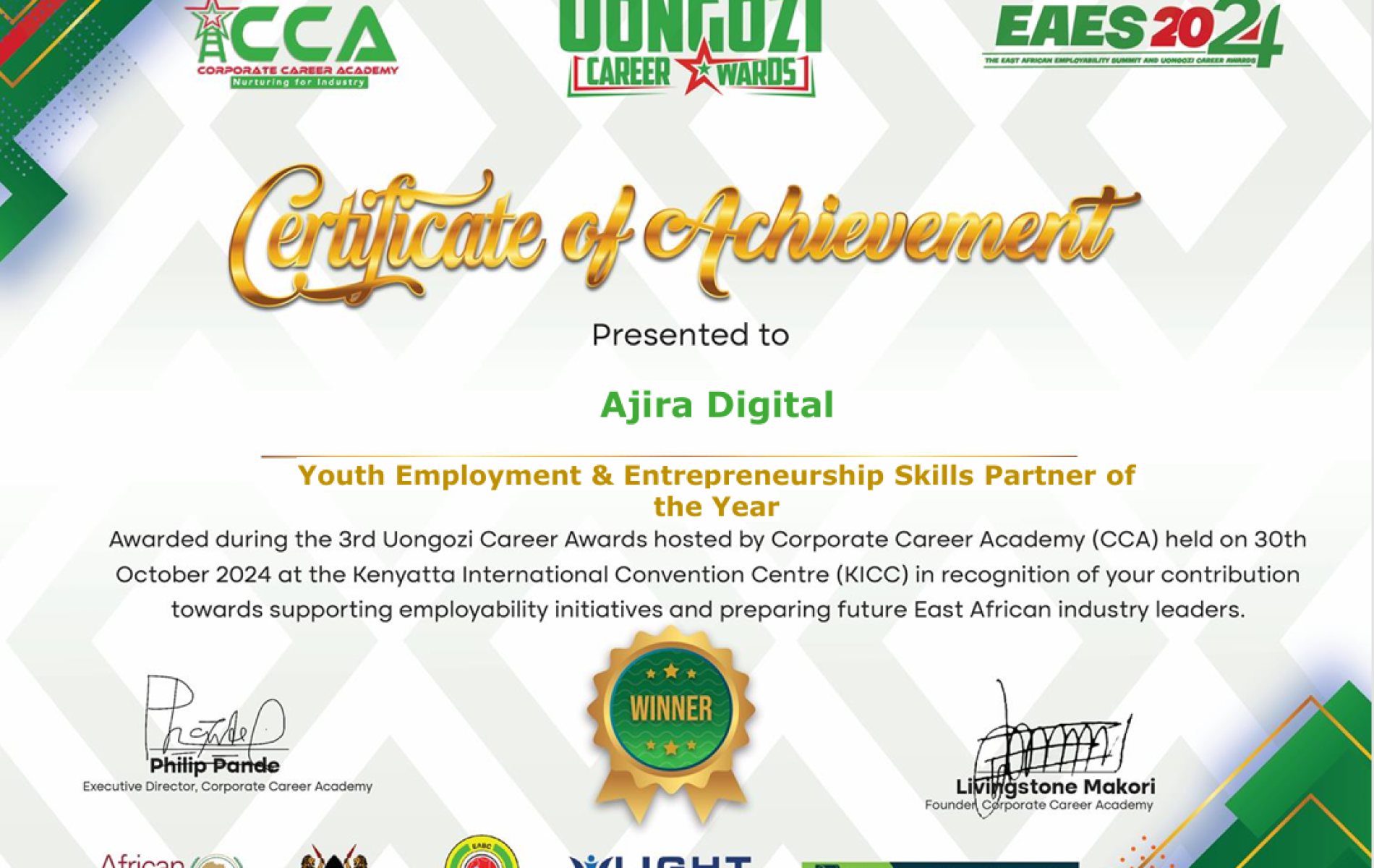 On October 29th and 30th, 2024, the iconic Kenyatta International Convention Centre (KICC) in Nairobi became the epicenter of dialogue and innovation as it hosted the East African Employability Summit and Uongozi Career Awards 2024. The event brought together over 500 policymakers, industry leaders, educators and young professionals to address the challenges and opportunities in preparing the workforce for a digital future. Among the highlights was the Ajira Digital Program, celebrated as the Youth Employment & Entrepreneurship Skills Partner of the Year. It further solidifies its reputation as a transformative digital empowerment and youth engagement force.